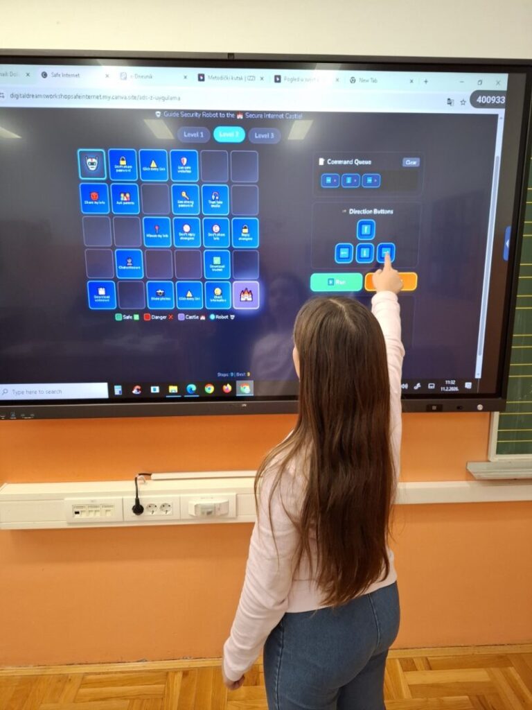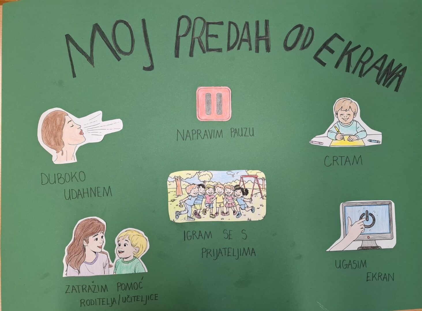Učenici su dijelili svoja iskustva te učili kako prepoznati vlastite osjećaje i reagirati na primjeren način. Poseban naglasak stavljen je na važnost ravnoteže između vremena provedenog online i aktivnosti u stvarnom svijetu. Na kraju radionice učenici su izradili plakat pod nazivom „Moj predah od ekrana“ na kojem su prikazali kako možemo reagirati u slučaju negativnih emocija koje nam donose ekrani. Uz pomoć igre kodiranja učenici su također ponovili i što je sve potrebno znati kako bi ostali sigurni dok koristimo internet.
