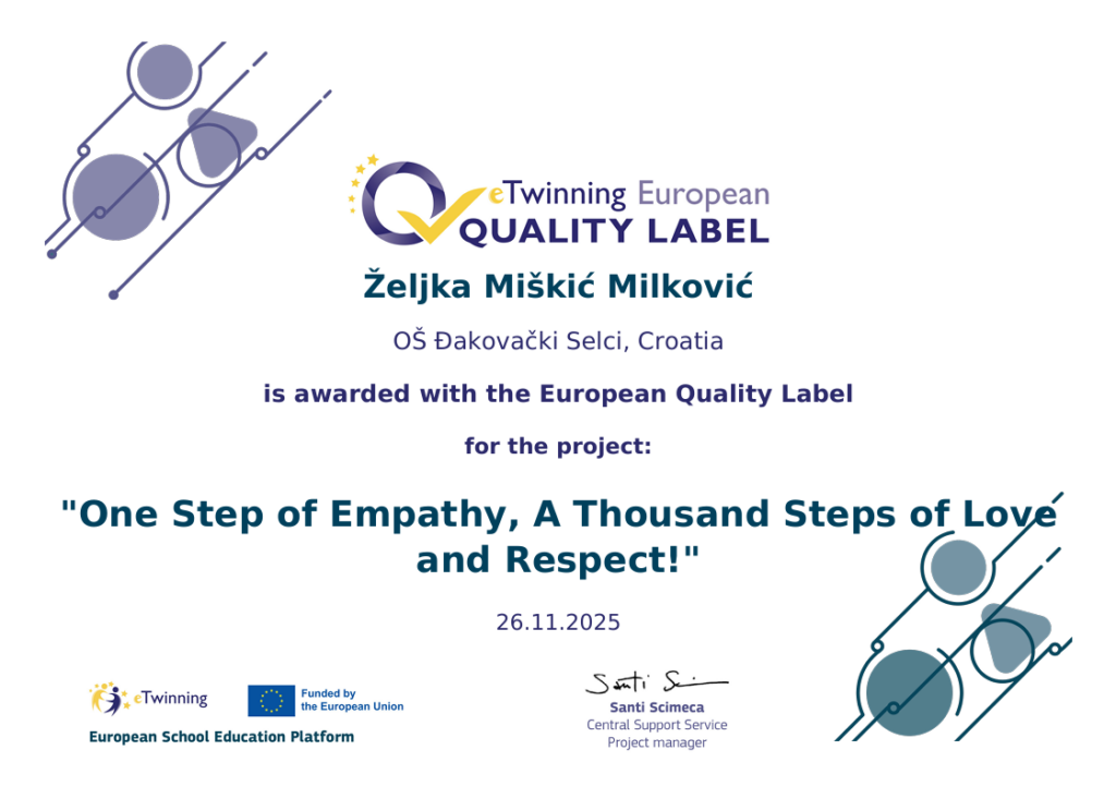 Projekti nagrađeni Europskom oznakom kvalitete tako su prepoznati kao najbolje rangirani i predstavljaju odlične primjere suradnje među partnerskim školama.
