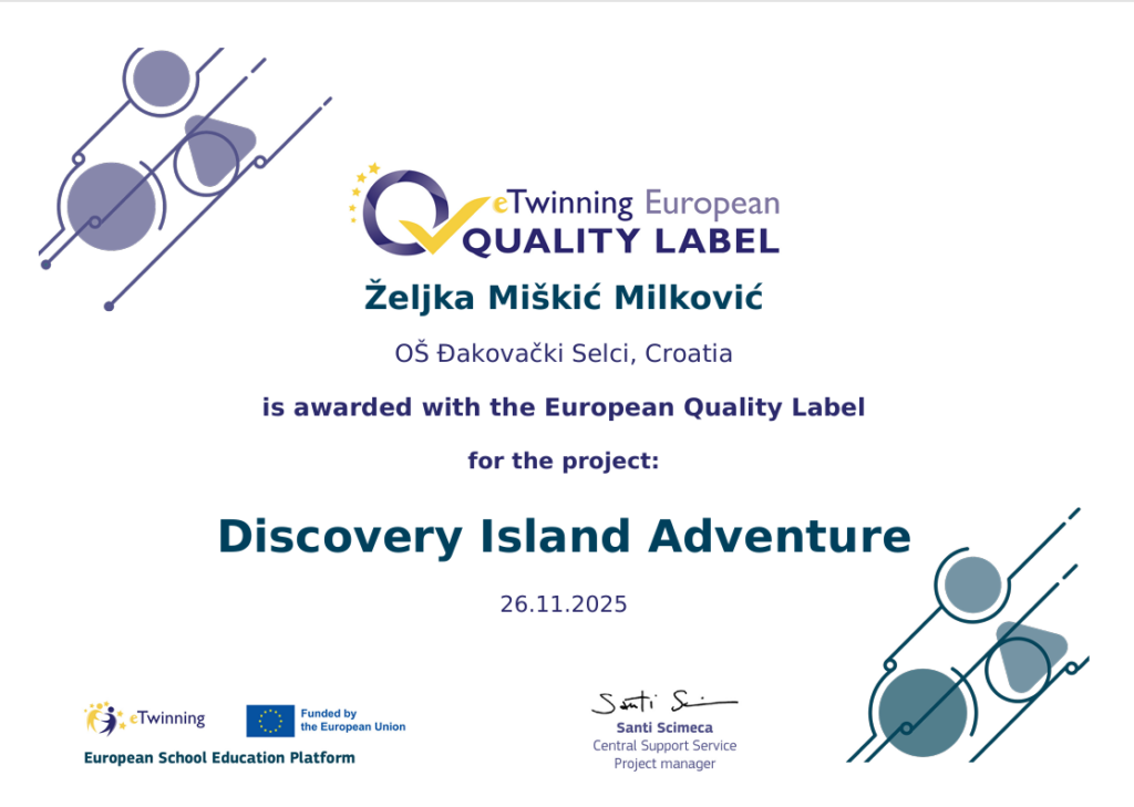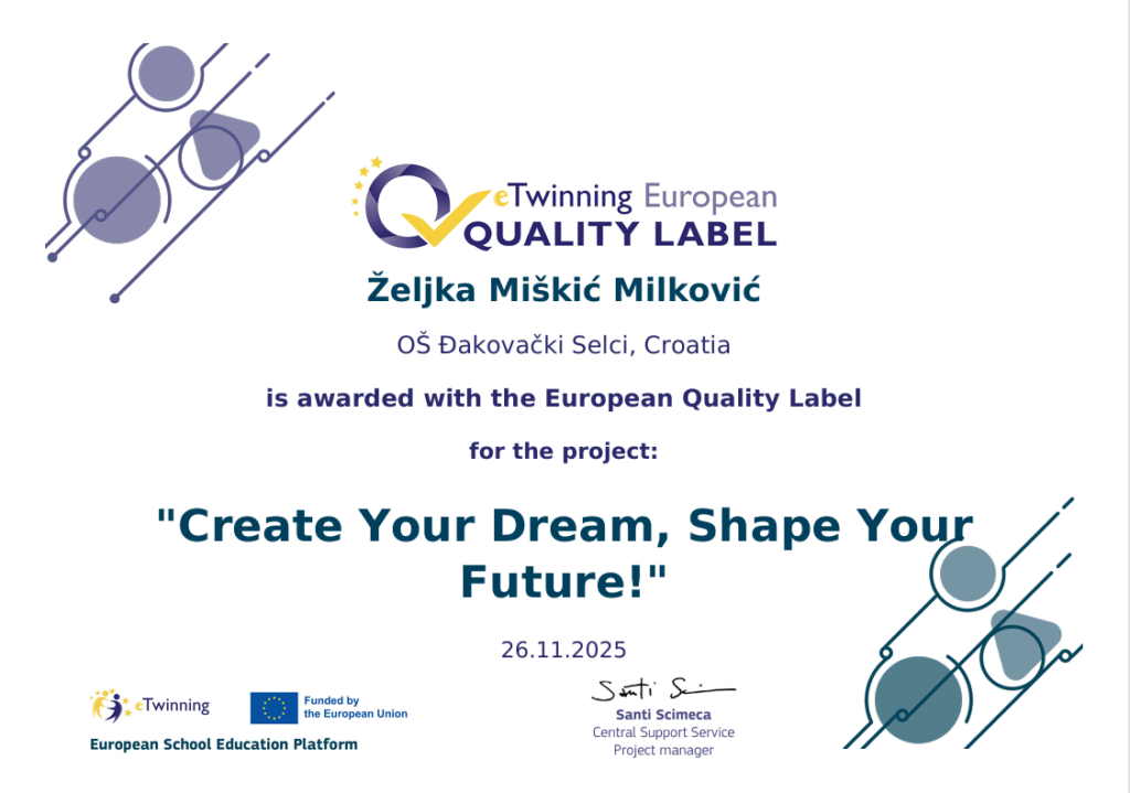 Nakon ljetos pristiglih pet Nacionalnih oznaka kvalitete, djelatnica naše škole nagrađena je i Europskim oznakama kvalitete. Učiteljici drugog razreda Željki Miškić Milković dodijeljene su tri Europske oznake kvalitete za projekte koje je provela s učenicima prvog razreda tijekom školske godine 2024./2025. Nagrađeni su projekti: