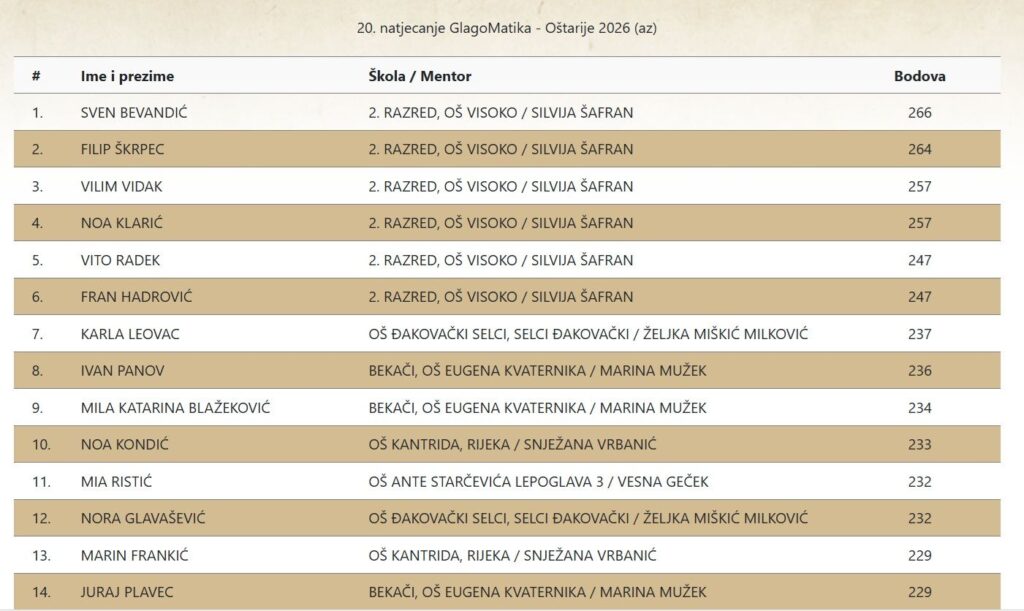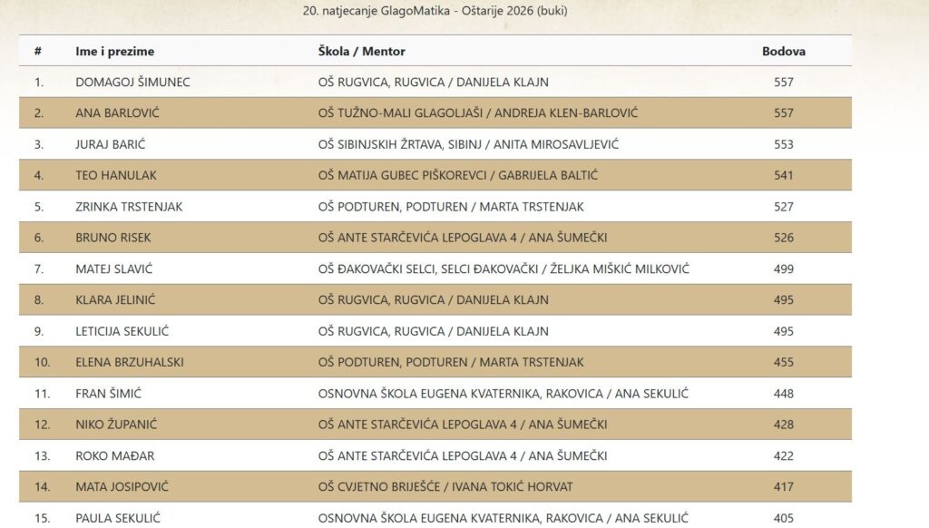 U četvrtak, 19. veljače, održano je 20. natjecanje GlagoMatika – Oštarije 2026. Natjecatelji su se i ovoga puta natjecali u poznavanju glagoljice. Cilj natjecanja je razvijanje interesa među učenicima za ulogu glagoljice u stvaranju hrvatskog identiteta kao i integracija nastavnih sadržaja matematike i kulturne baštine RH korištenjem inovativnih digitalnih alata za učenje.