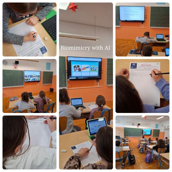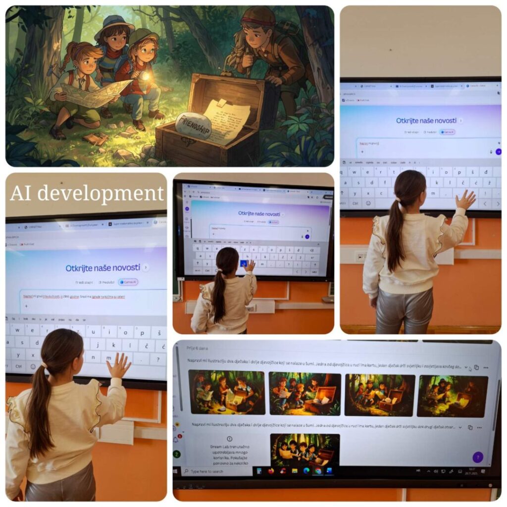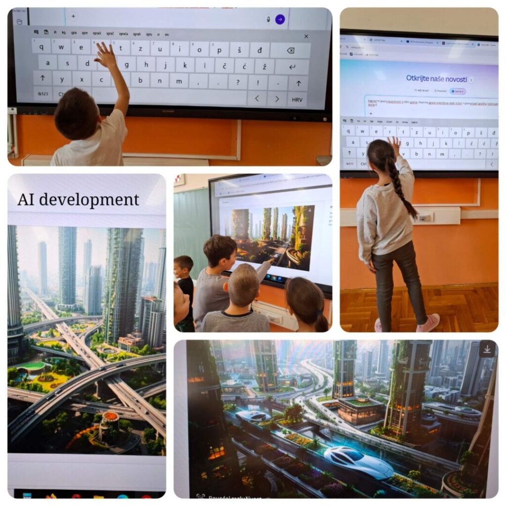 Osim učenika naše škole u ovom projektu sudjeluju i učenici iz Turske, Rumunjske, Italije i Grčke. Tijekom prvog polugodišta učenici drugog razreda upoznavali su razne alate umjetne inteligencije te ih povezivali s nastavnim gradivom Hrvatskog jezika, Likovne kulture te Prirode i društva. Učenici su tako osmišljavali priče prema zadanim riječima, a nakon toga ih AI alatima ilustrirali. Na satu Likovne kulture crtali su gradove iz budućnosti te ih uspoređivali s onim gradovima koje je za njih stvorila umjetna inteligencija. Na satu Prirode i društva istraživali su biomimikriju te i sami osmišljali nove izume inspirirane prirodom.